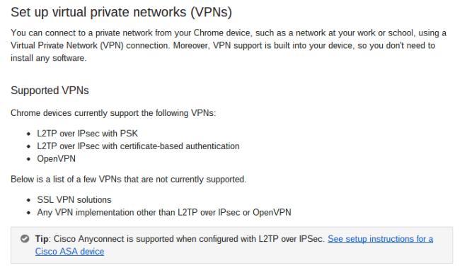 As it turns out, the built-in VPN solution, while great for some instances, isn’t great for me. You see, as I mentioned, we use an SSL VPN (which makes sense – all my top secret IP is moving over this connection). Well, this is what I found on the Google Chrome OS support site: